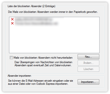Fügen Sie niemals die Adresse *@* zur Liste der Blockierten Absender hinzu, denn sonst erhalten Sie gar keine Mails mehr.